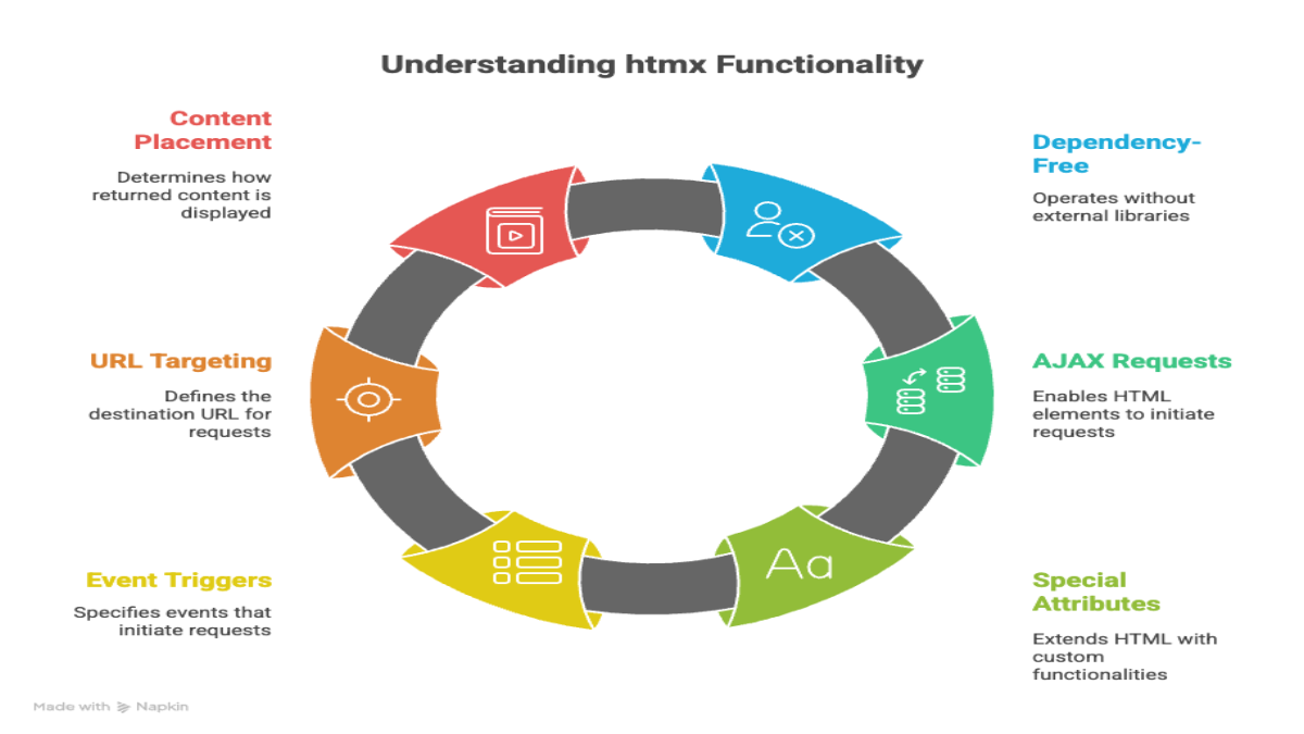 htmx is a dependency-free JavaScript library that allows you to make any HTML element issue an AJAX request. It extends HTML with a set of special attributes that tell htmx what event should trigger a request, what URL to hit, and how to place the returned content on the page.